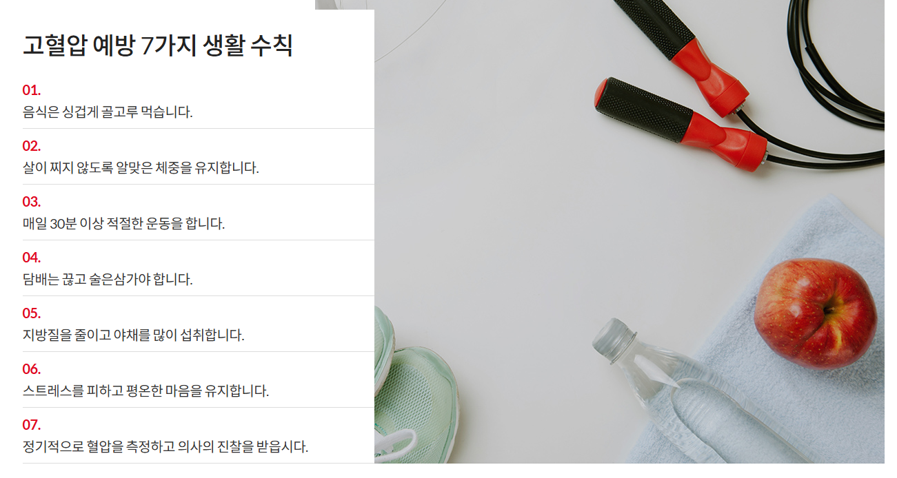 - 체중을 1kg만 감량해도 혈압이 떨어지니, 적정 체중을 유지하는 것이 중요합니다.